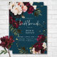 Este design de convite para apresentação de chá de casamento apresenta um tema elegante que é simples, mas espantoso. Um fundo azul escuro é a canvas perfeita para buquês de canto de flores realistas em branco-creme, rosa-pincel, burgundy e azul francês com folhagem verde-senada. Vibrante e rico em cores, este convite faz uma bela declaração. Criado pela imprensa simplesmente de farmácia.