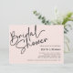 Convites de chá de panela minimalistas com "Chá de panela" no topo à esquerda, apresentados em um roteiro de caligrafia preta contra um fundo cor-de-rosa-pincelada. Personalize os convites de chá de panela cor-de-rosa com o nome da noiva-a-ser e os detalhes da parte chá abaixo. O convite para chás de panela contemporâneo pode ser invertido para revelar um fundo rosa sólido