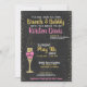 Chá de panela cor-de-rosa, dourado e brasa preta, com fundo de chalkboard, vidro de champanhe dourado com bolhas de coração e casais.