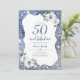 Faux brilho azul-prateado brilhante com script "50 e fabuloso" com azul empoeirado e branco floral, elegante e na moda, excelente 50º convites de festas de aniversários.