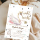 Esta estrela rosa e dourada cintilação brilha, cisne e flores. Esses convites para chuveiros de bebês são facilmente personalizados para seu evento simplesmente adicionando seus detalhes.