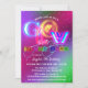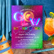 Um convite de aniversário festivo com um tema colorido no escuro.