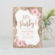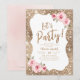 Fundo brilhante de ouro falso e floral cor-de-rosa pincelado com script de "festa de vamos" no centro, elegante e na moda, convites de excelente para festa de aniversário, festas de férias, festa de noivado ou outras ocasiões especiais.