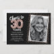 Elegante convite de aniversário de trinta anos com um fundo preto elegante que pode ser alterado para qualquer cor, uma foto da aniversariante / do aniversariante, brilho cintilante rosa dourado, trinta balões de hélio rosa dourado, e um modelo de texto de celebração de aniversário de 30 anos moderno e fácil de personalizar.