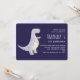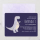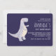 Um convite de aniversário com uma ilustração fofa apresentando um dinossauro roxo acinzentado. Fundo roxo escuro.