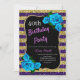 Púrpura elegante e listras douradas brilham e convites de aniversário azuis para mulheres de qualquer idade. A idade pode ser alterada para qualquer idade. O texto pode ser alterado para qualquer coisa para ajustado do seu evento. Fontes, cor da fonte e texto são completamente personalizáveis! A forma e o tipo do papel podem ser personalizados para ajustado do seu orçamento e sabor!