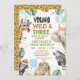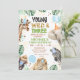 Young, wild and three birthday invitation for boy featuring various jungle animals, party hats, balloons and tropical foliage. Ideal for a boys jungle themed 3rd birthday party.