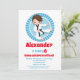 O convite de aniversário deste rapaz apresenta um garoto de artes marciais de cabelos bonitos com cinto preto. Sobre fundo decorativo azul.