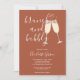 Um chá de panela elegante e elegante, com óculos de champanhe e nome de script de assinatura, este convite para na moda pode ser personalizado com suas informações em letras quentes em um fundo de terracota. Projetado por Thisnotme©