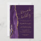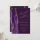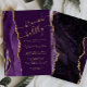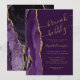 A extremidade esquerda deste convite de chá de noiva elegante e moderno para brunch e espumante apresenta uma borda de água roxa com efeito de ágata, decorada com brilho dourado. O texto personalizável combina caligrafia dourada, fontes copperplate e itálico sobre um fundo cor de ameixa. O lado reverso apresenta um desenho correspondente de ágata roxa e dourada.