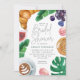 Convide convidados para um belo brunch de chá de panela de verão com estes belos convites para aquarelas. A design apresenta os detalhes de sua celebração em caracteres modernos, rodeados por ilustrações de pastores do café da manhã, croissants, macarons, café e verde tropical exuberante com folhas de banana e folha de monstera.