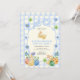 Convite de brunch de Páscoa e caça ao ovo com coelhinhos fofos. Ilustração em aquarela de coelhos, flores de primavera e ovos, e moldura com laço em fundo xadrez azul bebê. Você pode personalizar o convite com seu texto.