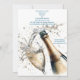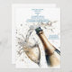 Chá de panela de Brunch e Bubble. Imagem bem ilustrada de uma garrafa de champanhe sendo derramada em um vidro de cristal. O champanhe é espumante e brilha na luz, com gotículas de líquido esparramando por aí, criando uma atmosfera enérgica e celebratória.