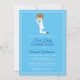 Convide amigos e família para celebrar a Primeira Comunhão dos seus filhos com este convite que inclui um rapaz morena num terno de comunhão branco segurando um rosário num fundo azul suave. A parte traseira apresenta fundo azul suave e quadro branco duplo com cruz azul, pombos e faixa branca com o texto "Minha primeira comunhão". Fácil de personalizar com opções personalizadas. Use o botão 'Personalizar' para personalizar o produto ou adicionar texto.