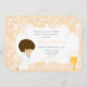 Este convite da Primeira Comunhão Damask apresenta um adorável cabeleireiro marrom em um primeiro terno de comunhão sagrado.