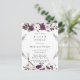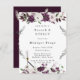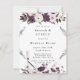 Design apresenta um elemento floral impresso em tons roxos, violetas, lilases e brancos sobre folhas de folhagem rosas e pedras sobre um fundo de aquarela roxo. Excelente para as comemorações do casamento!