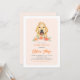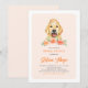 Convide convidados para o seu evento com este convite para brunch personalizável. Apresenta ilustrações de aquarela de um fofo recuperador de ouros com um chapéu e flores de pêssego. Personalize adicionando seus detalhes. Este convite para brunch de ouro é perfeito para chás de panela de primavera e verão.