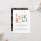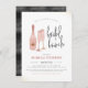 Esta design moderna mostra uma ilustração desenhada à mão de uma garrafa de champanhe e dois copos de champanhe em lindos tons de rosa e ouro. À direita, aparece "brunch" (bronze) em letras escritas negras. O nome da noiva aparece abaixo em maiúsculas rústicas com os detalhes do evento do chá. Nos cantos superior direito e inferior esquerdo, há aparas falsas de ouro. Cartões inverter para uma imagem de textura de tinta preta contra um fundo branco. Clique em "Personalizar" para alterar o texto. Fique à vontade para me contactar se tiver alguma pergunta!