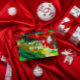 Este cartão de saudação de Natal moderno apresenta um fundo de pincelada de abstrato de Natal, uma simples borda branca Vermelha Festiva, verde, dourada e branca. Texto personalizável em preto e branco.