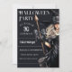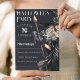 Testemunha em fantasia negra com arcos de cetim preto e uma vassoura assustadora na frente e no verso deste convite de festas de Halloween que você pode personalizar. A bruxa está vestindo um colar de joias pretas e está adornada com arcos de cetim para a noite de Halloween. Adicione todos os detalhes de sua parte na frente e há espaço na parte traseira para adicionar informações adicionais para seus convidados. Aproveite a sua festa!