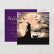 Mágica para o Dia das Bruxas. Um pano de fundo com um azul roxo colorido, nublado, céu noturno com estrelas e uma lua de cheio laranja que tem os silhuetas de uma bruxa, um gato, morcegos e uma árvore adormecida.