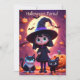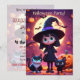 Este convite apresenta uma pequena bruxa com um vestido preto com gatos e abóboras na noite de Halloween.
