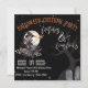 Uma bruxa bonita com um chapéu grande com seu gato preto em uma vassoura em frente a uma lua de colheita. A frente do cartão também tem duas tombstonas bonitinhas na parte inferior direita do cartão e uma árvore mística escondida no fundo. Este convite à Festa de Figuras de Halloween e Bruxas de Bruxas é surpreendente e encantador para seus convidados. O reverso desta carta tem a bruxa bonitinha de chapéu grande com seu gato preto numa ilustração de vassoura centrada. Fundo preto com esferas de cinza. Informações sobre o convite da parte, como mês, data, dia da semana e endereço, horário da festa e informações de RSVP, são totalmente personalizáveis.