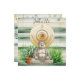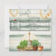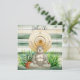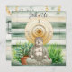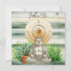 Buda descansando em grama verde fresca com uma planta cercada e uma joelho esquerdo aparecendo. Buddha está posicionado em frente a um gongo de ouro e há um design verde e marfim no fundo. O reverso deste convite de festas de aniversário, reforma ou celebração de jardins é totalmente personalizável. Adicione todos os detalhes de sua parte e informações adicionais para seus convidados na parte traseira deste cartão. O reverso contém um gráfico inspirado pelo Buda diferente com plantas com vaso. Perfeito para entusiastas e jardineiros de ioga. Tenham um excelente na sua festa!