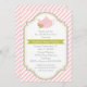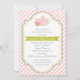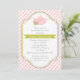 Bule de chá e listras cor-de-rosa, chá de panela verde apresentando um bule de chá rosa com um motivo floral branco, flores de peônia, um banner de verde limão, um quadro e um padrão listrado branco rosa. Este na moda é um modelo perfeito para um primavera, verão ou casamento outono/outono. Texto em cinza e branco.