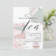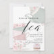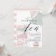 Este elegante convite para chá de chá de panela apresenta um fundo branco com um bule de chá e xícaras de chá com flores. O verso apresenta um fundo branco com listras cor-de-rosa pinceladas. Personalize-o para as suas necessidades. Você pode encontrar produtos correspondentes na minha loja.