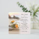 Buquê de laranja e noiva branca num pedaço de madeira derivada numa praia com fundo oceânico. Todo o texto pode ser alterado. A cor de fundo pode ser alterada.