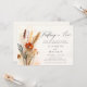 Um belo buquê de flores secas, flores silvestres, verde e grama-palha, pintado em delicada e romântica aquarela, com tons de marrom-terra, bege e alaranjado, cria um elegante quadro floral para este convite à festa de noivado de casal de outono com uma queda no tema do amor, que também apresenta caligrafia moderna. A design é uma mistura eterno de sofisticação clássica e o charme lúdico das flores, perfeito para o romântico moderno. Ideal para um noivado de outono, este convite combina tanto com a elegante noiva e noiva boêmica e com aqueles que planejavam uma festa de jardim, uma celebração de quintal ou um evento formal nos jardins de um château. Uma bela escolha para as noivas que procuram um toque do capricho da natureza com elegância refinada.