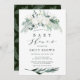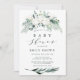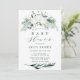Este convite para chás de fraldas apresenta verde-inverno pintado à mão, flores de algodão com texturas de ouro e aquarela, e um padrão de galho verde-vivo no verso. Para personalização mais avançada deste design, clique no link "personalizar mais". Itens correspondentes também estão disponíveis.