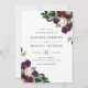 Convites florais elegantes com detalhes de seu casamento com buquês de ameixa escura e flores brancas de aquarela, acentuados pela folha de ouro falso rosa e folhas verdes nos cantos. O convite reverte para um fundo sólido e escuro de cor de ameixa. Projetado para coordenar com a nossa coleção de casamento Dark Plum Floral.