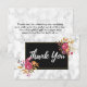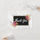 Um cartão de agradecimento de casamento com fundo de mármore branco. Sobreposto a ele, há uma moldura preta com uma fina borda dourada. Os cantos são decorados com buquês de flores rosa. Elegante e sofisticado. O verso tem uma mensagem de agradecimento com seu nome, que você pode personalizar ou remover.