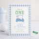 Tema do primeiro aniversário de golfe "Buraco em um" com carrinho de ouro e padrão de xadrez azul-claro.