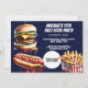 Um gráfico de aquarela vibrante, fascinante e divertido, que contém um cheeseburger de duas partes com alface, queijo derretido, ketchup e mostarda; um cachorro quente com um molho e uma caixa riscada vermelha e branca com batatas fritas, tudo colocado sobre um fundo azul escuro que tem modelos de texto branco editáveis para a sua redação personalizada. Esta design é ideal para uma "comida rápida"; "comida de lixo"; "em hambúrguer" ou "construir seu próprio" tema de comida, aposentadoria, aniversário, escória ou robalas de solteiro ou evento comercial.