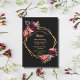 Na frente: Um convite para uma 18ª festa de aniversário. Um fundo preto chic com uma falsa estrutura geométrica dourada. Decorados com flores, rosas e penas do estilo "boho" escuras e burguesas. Modelos para um nome e detalhes da festa. O nome é escrito com um script de estilo manuscrito, letras ouros coloridas. Fundo preto e grandes rosas peludas em burgundy e roxo.