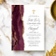 A borda esquerda deste elegante e moderno convite de primeira comunhão apresenta uma borda vermelha e arrojada de cor d'água, bordada com falso brilho dourado. Uma cruz falsa de folha de ouro aparece acima do texto personalizável, que combina escrita manual, copperplate e fontes itálicas em cinzas de carvão em um fundo branco. O lado inverso apresenta uma burgundy e uma design de agata dourada.
