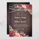Estes convites de casamento rústicos apresentam um design floral de aquarelas com flores de burgundy e blush em um fundo de madeira rústica com luzes de cordas. Personalize com seu próprio texto.
