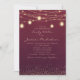 Convite de casamento moderno, elegante e chic burgundy com brilho dourado, luzes de cordas e lanternas. Texto, fonte e texto são completamente personalizáveis com a ferramenta design fácil de usar do Zazzle. Este convite pertence à nossa Burgundy com a Coleção de Casamentos Glitter e String Lights Dourada. Entre em contato conosco para obter ajuda com a personalização ou para solicitar produtos adicionais correspondentes.
