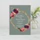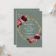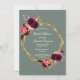 Na frente: um plano de fundo verde da moda com um falso quadro geométrico dourado. Decorados com flores, rosas e penas do estilo "boho" escuras e burguesas. Modelos para o nome da noiva e detalhes da festa. O nome é escrito com um script de estilo manuscrito, letras brancas coloridas. Traseiro: cor verde de fundo sage.