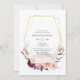 Convite para festa de noivado de casamento floral Boho com peônias e rosas com estrutura geométrica dourada personalizável para suas especificidades de evento.