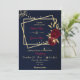 elegantes flores burgundy de luxo com algumas folhas de ouro em dois retângulos dourados convite de casamento azul de marinho Os detalhes de brilho são simulados