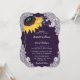 Este convite floral para o casamento, com um girassol contra uma burlap e um fundo de rendas enfeitado com luzes de cordas é perfeito para convidar seus convidados para sua festa de casamento roxa rústica inspirada por girassóis. Fácil de personalizar a modelo. design personalizável a 100%.