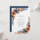 This artistic design features a rich palette of burnt orange blooms accented with deep navy foliage. A painterly watercolor style evokes a sophisticated yet organic mood for a memorable occasion. The arrangement flows gracefully across the canvas.