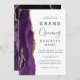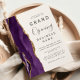Convide os clientes para a grande abertura da sua empresa com este elegante convite moderno, com uma borda de cor d'água púrpura, aparada com brilho de ouro falso. O texto personalizável combina a escrita manual de cinzas de carvão, as fontes em copperplate e itálico em um fundo branco. O verso apresenta um design de agate roxo e dourado correspondente.