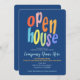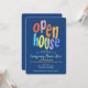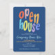 Um convite à casa aberta de empresas ou empresas. Este convite fabuloso apresenta uma tipografia ousada e moderna num fundo azul. Fácil de personalizar com seu próprio evento de casa aberta ou detalhes de celebração de lançamento.