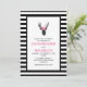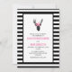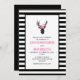 Um convite de casamento com uma cabeça de cervo preto feita com linha geométrica e vestindo uma coroa floral rosa. Design russa e de tendências. O fundo é listras brancas e pretas. Um quadro branco com uma borda preta colocada sobre o topo.