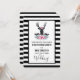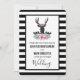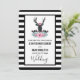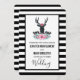 Um convite de casamento com uma cabeça de cervo preto com grandes galhadas. Linhas geométricas dentro na face do veado acrescentam um toque criativo. Uma flor rosa colorida e folhas verdes de menta formam uma coroa sobre sua cabeça e um buquê floral também repousa abaixo. Um esboço de serra colocado entre as flores também agrava o sentimento rústico do país. O fundo é um padrão listrado preto e branco.